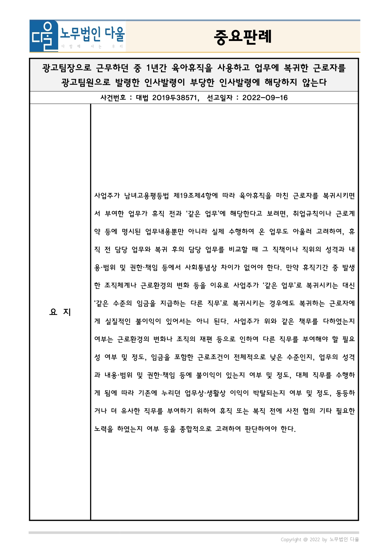 광고팀장으로 근무하던 중 1년간 육아휴직을 사용하고 업무에 복귀한 근로자를 광고팀원으로 발령한 인사발령이 부당한 인사발령에 해당하지 않는다